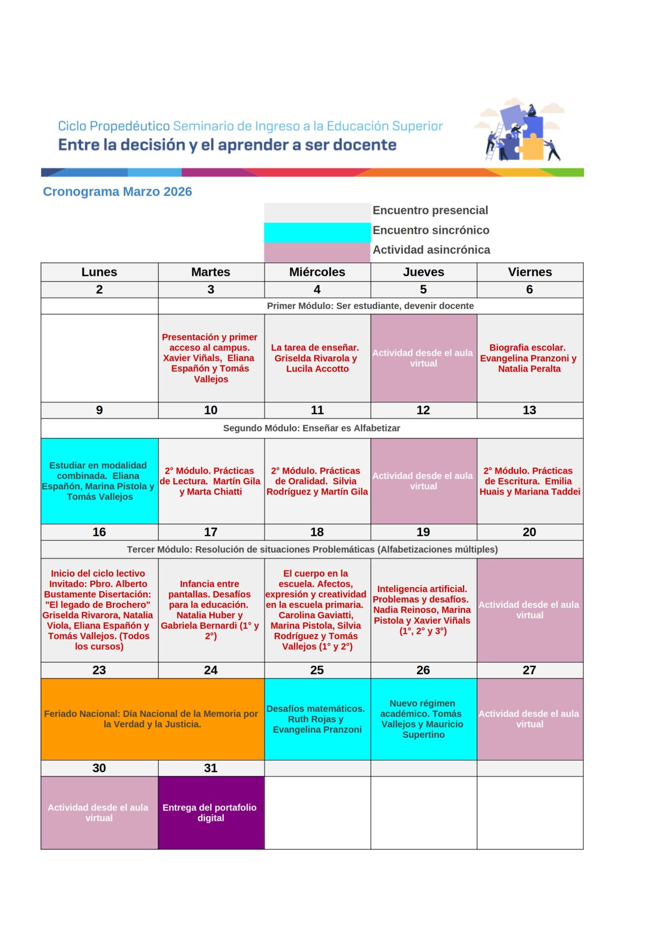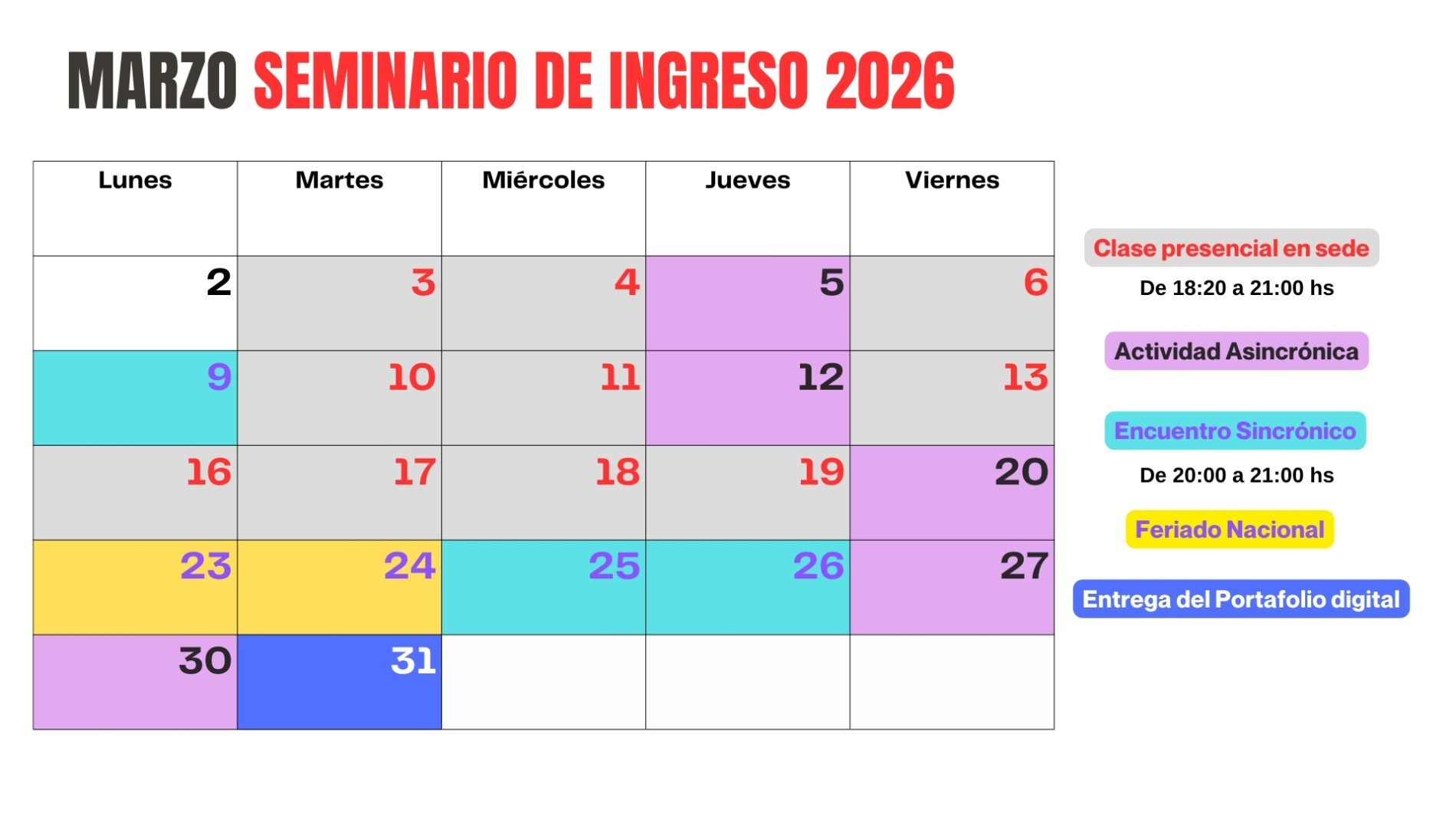 El Seminario de Ingreso 2026 es la puerta de entrada a la carrera que elegiste cursar. Tiene carácter introductorio y nivelatorio. Se realiza de modo combinado, es decir, con actividades presenciales, que consisten en clases dictadas en la sede del Profesorado y encuentros sincrónicos -videoclases-. También se proponen actividades remotas y de modo asincrónico, como la participación en foro o la elaboración de ejercicios prácticos por medio del Campus Virtual.